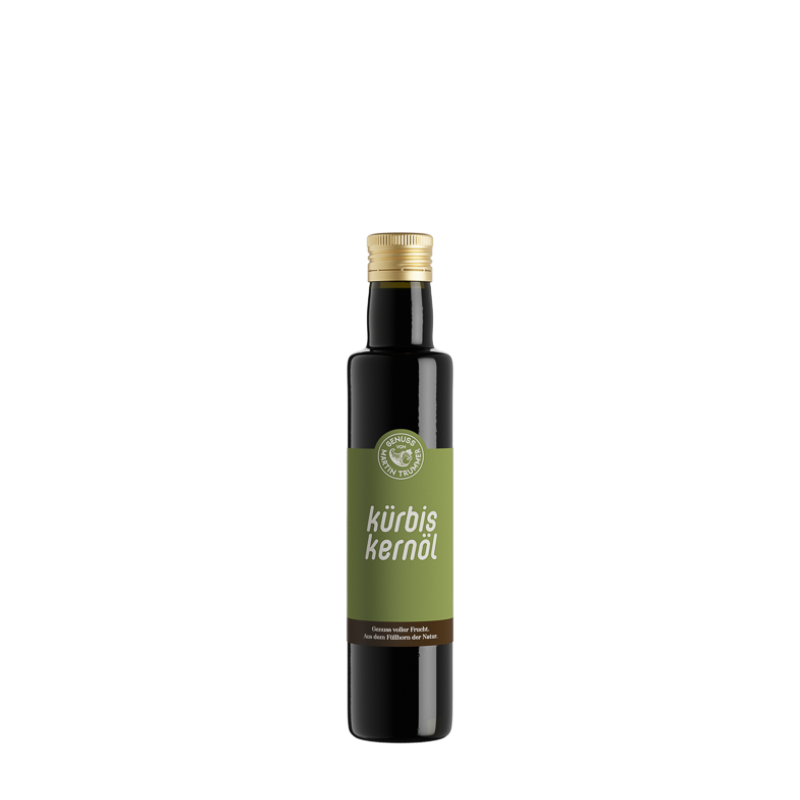 Ein kerniger Genuss aus dem Füllhorn der Natur. Unser hocharomatisches Kürbiskernöl wird rein aus sorgfältig gerösteten Kürbiskernen gewonnen und besticht vor allem durch sein typisch nussiges Aroma und der tiefgrünen Farbe. Es eignet sich hervorragend für Salate aller Art sowie zum Verfeinern von süßen und pikanten Gerichten. 100 % reinstes Kürbiskernöl aus dem Südburgenland.